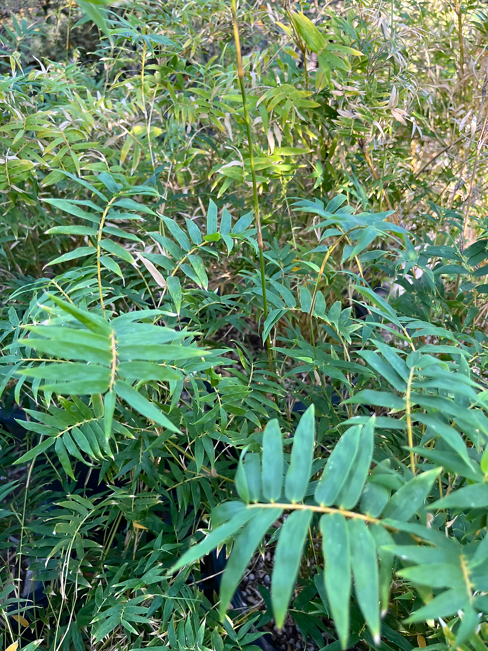 This small clumper has both petite leaves, similar to Tiny Fern, and bigger leaves typical of B. multiplex. It has green culms with yellow stripes. It only gets about 12’ tall with 3/4” diameter canes. It's cold-hardy to 12ºF.
